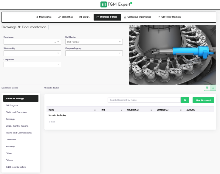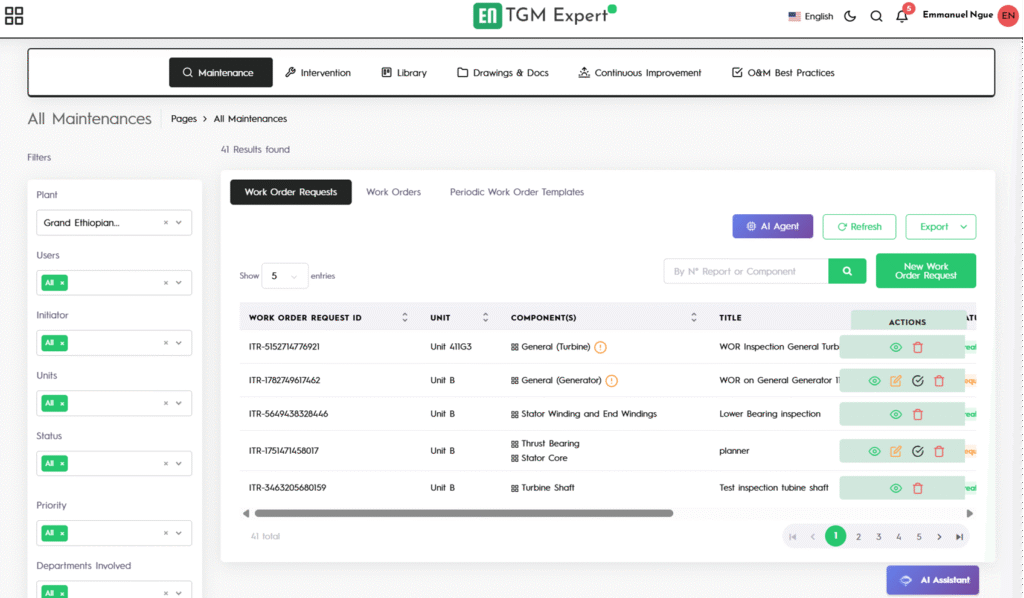 TGM O&M TGM O&M ofrece una solución de software integrada diseñada para optimizar y respaldar todas las actividades de Operación y Mantenimiento de centrales hidroeléctricas. Con una plataforma centralizada, TGM O&M agiliza la gestión de tareas de mantenimiento, intervenciones, documentación y planos técnicos para cada activo. El sistema también facilita las iniciativas de mejora continua, recopila las mejores prácticas y mantiene una completa base de datos de fallos que abarca turbinas, generadores y otros activos hidroeléctricos clave. Al implementar TGM O&M, las organizaciones pueden mejorar la fiabilidad operativa, reducir el tiempo de inactividad y tomar decisiones de mantenimiento más inteligentes basadas en datos.